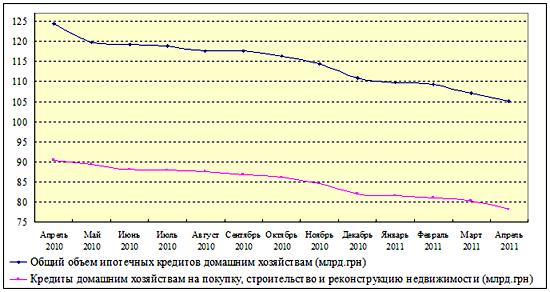 В 2010 году среднемесячный объем новых кредитов, выданных «домашним хозяйствам» на приобретение, строительство и реконструкцию недвижимости, составил всего 0,188млрд. гривен. На этом фоне 0,261млрд. гривен в апреле 2011 года означает рост почти на 39%.