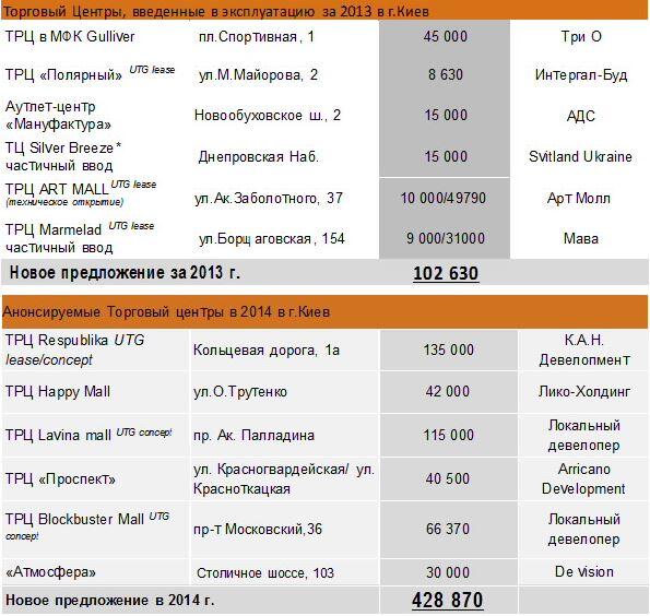 Эксперты прогнозируют, что в ближайшие годы эта тенденция сохранится. Так, на 2014 год запланировано введение в эксплуатацию более 428 тыс кв. м торговых площадей в Киеве. Самые крупны торговые центры, которые должны открыться в нынешнем году, - это ТРЦ Республика, ТРЦ Blockbuster Mall и ТРЦ Lavina mall.