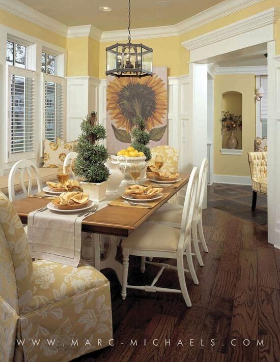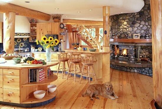 Интерьер в стиле шале или кантри, отделанный деревом, также благоприятен для букета подсолнухов: теплые цвета этих растений придадут ощущение уюта кухне.