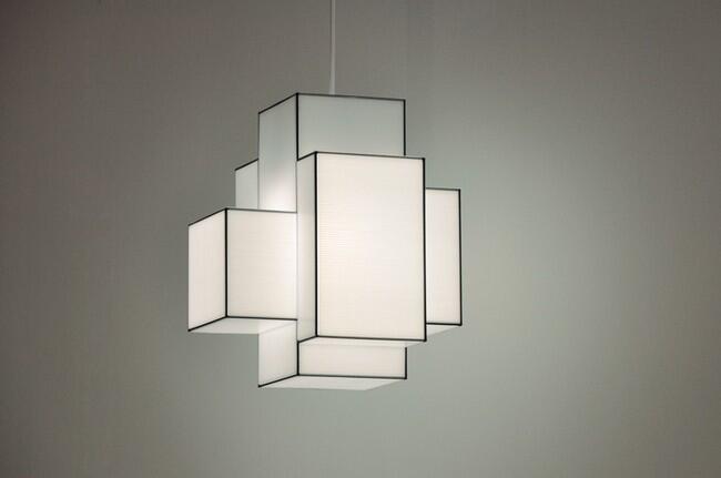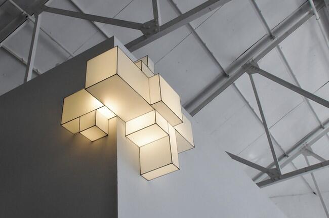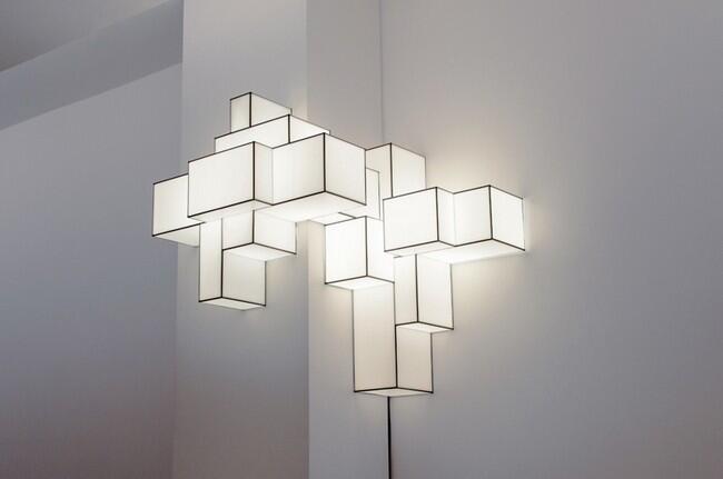 Светильники состоят из тонких стальных прутьев, которые скрепляются между собой, образуя кубы и параллелепипеды, затем металлический каркас покрывается легким светопроницаемым пластиком.