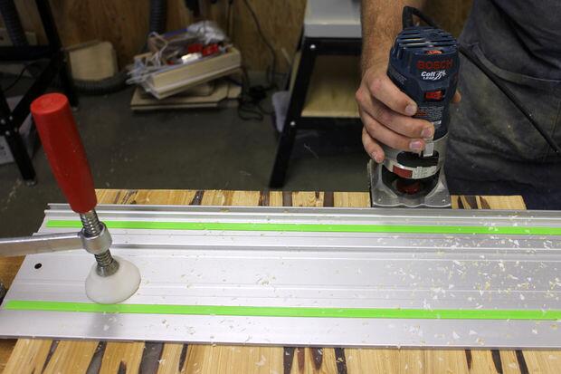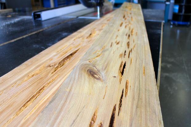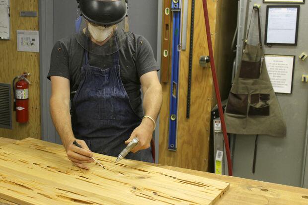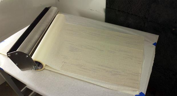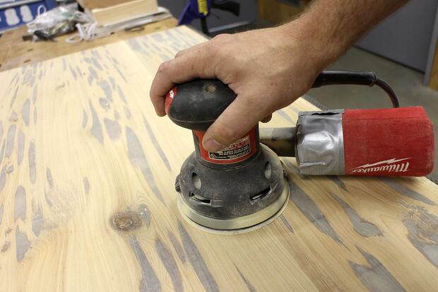 После этого очищаем трещины деревянной поверхности от мусора и пыли. Потом специальным инструментом, к примеру, орбитальной шлифовальной машинкой, шлифуем поверхность, подготовленных деревянных досок. Удаляем пыль с будущей столешницы и приступаем к этапу обработки эпоксидной смолой — для этого тыльную и боковые стороны столешницы заклеиваем акриловой плёнкой и малярным скотчем.