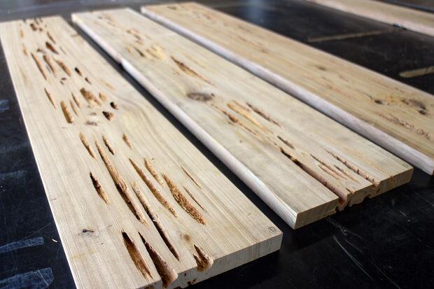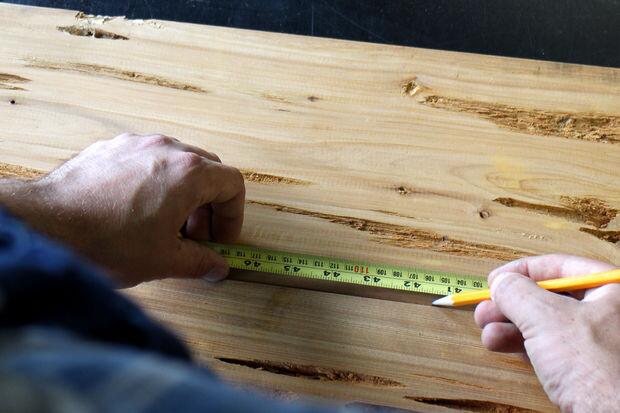 Берём деревянную доску цвета болотный кипарис с трещинами. Отмеряем 3 отрезка по 41,5 см (по желанию можно отмерять другую подходящую длину доски).
