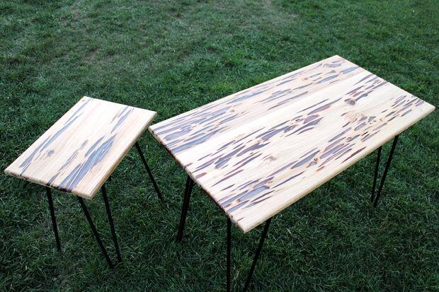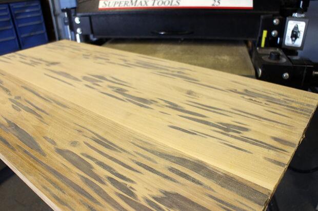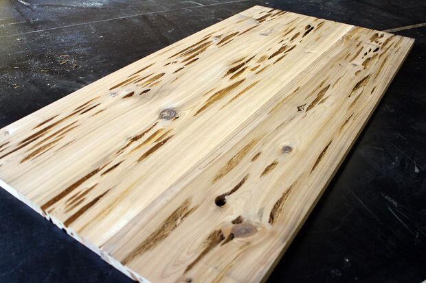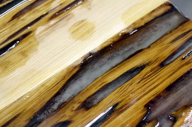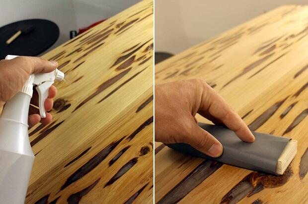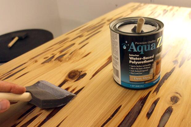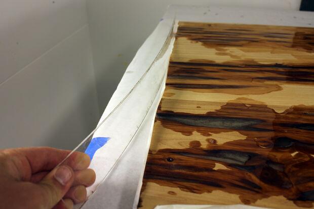 После того, как смесь эпоксидной смолы с краской затвердеет, с деревянной поверхности снимите акриловую пленку и малярный скотч, а потом удалите при помощи острого ножа остатки затвердевшей смолы. Далее хорошо отшлифуйте поверхность и покройте её глянцевой полиуретановой краской.