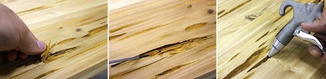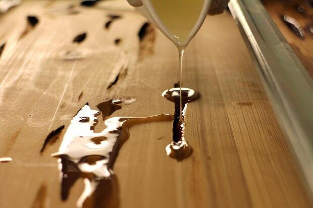 Теперь полученной смесью заливаем трещины на деревянной поверхности. Эту процедуру проделываем несколько раз, так как изготовленный раствор в дерево впитывается медленно и трещины постепенно заполняются заливаемой смесью. Рекомендуется процедуру заливки раствора в трещины провести не менее 10 раз — это займет приблизительно один час времени. После чего столешницу оставляем на ночь сохнуть.