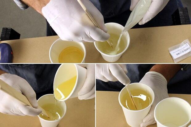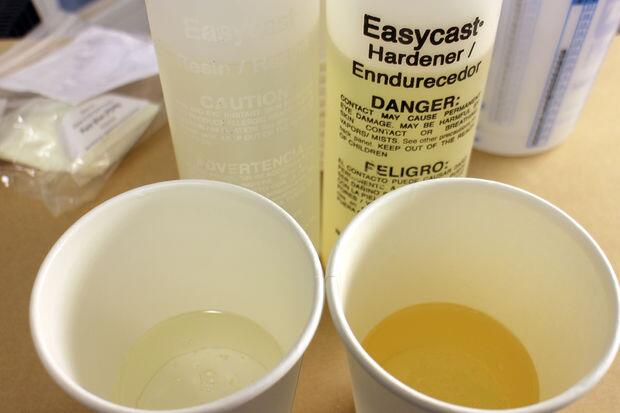 Процесс смешивания смолы с отвердителем и люминесцентной краской займёт не более 2 минут. В большие бумажные стаканы равными порциями влейте смолу и отвердитель, добавьте краску и тщательно перемешайте.