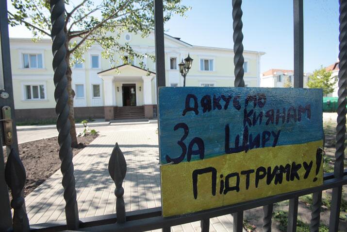 В Межигорье ежедневно приезжают экскурсанты — взглянуть на резиденцию экс-президента Януковича. А в домах, предназначенных для прислуги и охраны, сейчас живут переселенцы из Донецка. Во дворе гуляют дети, а их родители занимаются хозяйством.