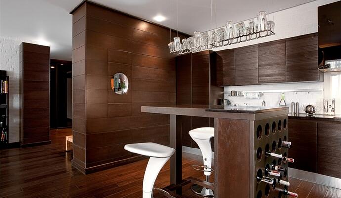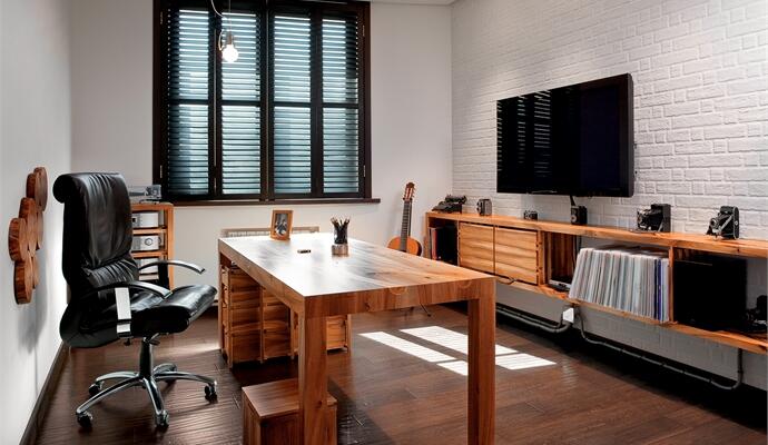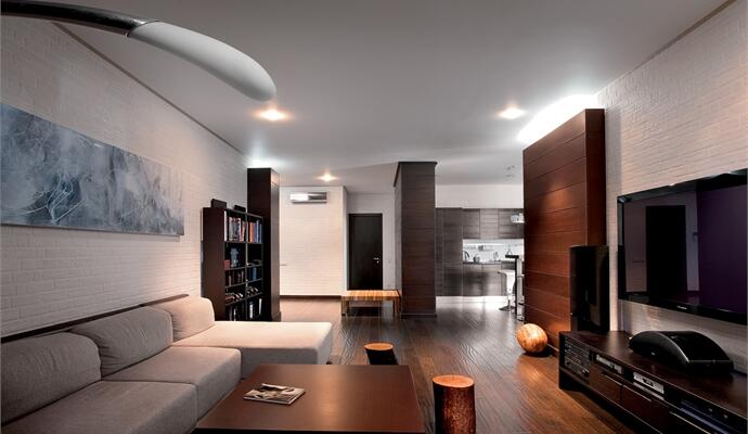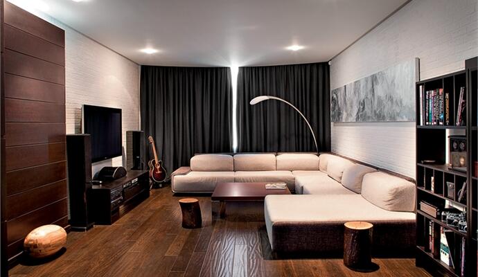 Когда заказчик обратился к дизайнерам, речь шла о холостяцком жилье — добротном, сдержанном и дорогом, как хороший виски. Нужна была «вторая кожа» — уютная, но прочная оболочка со скроенной по индивидуальным меркам атмосферой и накопленным «багажом»: коллекциями виниловых пластинок, старинных фотоаппаратов, граммофонов и печатных машинок. Среди обязательных пожеланий — оснащение хорошим звуком и перманентно приглушенное освещение, идеально отвечающее потребности в релаксации (ставни, тонированные стекла и плотный текстиль на окнах справляются с задачей даже в самые яркие дни). Заданный образ благородного интерьера и сегодня «прочитывается» на все 100%, но появились нюансы, новый контекст.