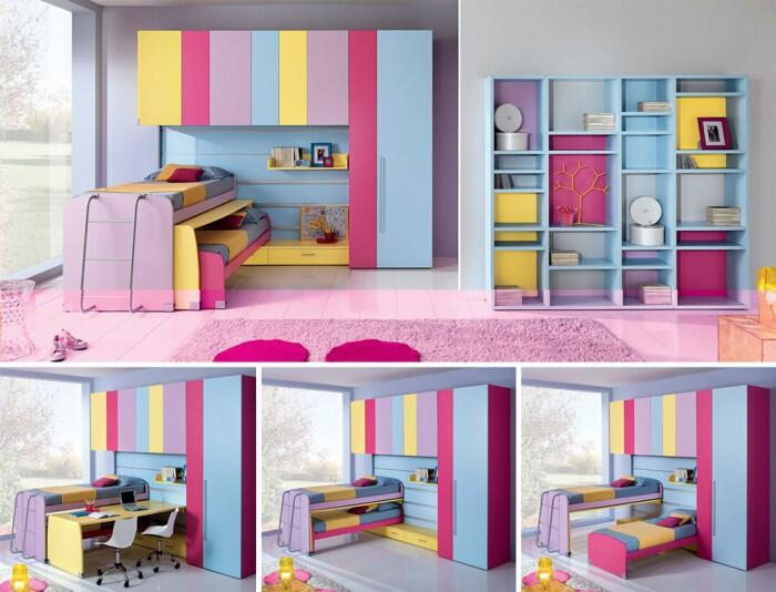 Кроме того, для маленьких комнат идеально подойдут трансформирующиеся конструкции, которые позволяют не только разместить в одном месте кровать, шкаф и стол, но и выборочно использовать предметы, которые необходимы в текущий момент. Например, когда ребенок садится за уроки, стол выкатывается вперед, а кровать задвигается под шкаф, и наоборот, перед отходом ко сну наружу выдвигается кровать, а стол прячется под шкафом. Во время активных игр можно спрятать в шкафу и стол, и кровать, освободив пространство детской. Такая мебель очень компактна, мобильна и проста в использовании.
