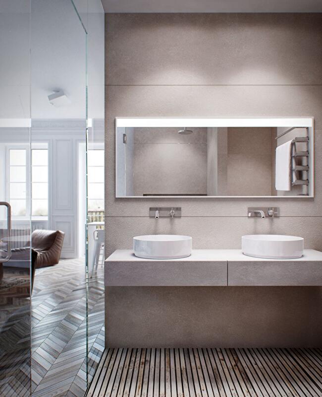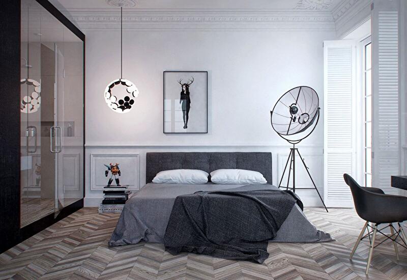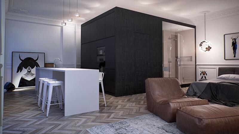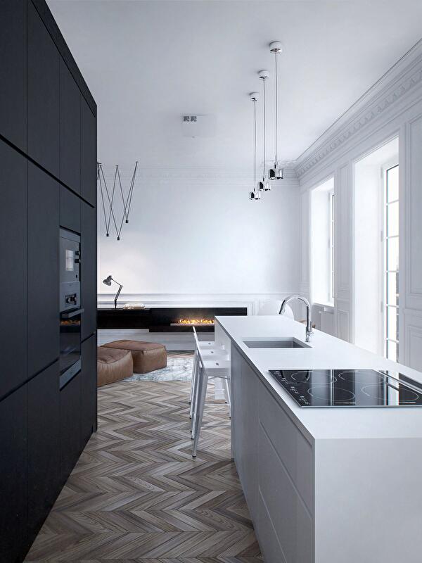 В дизайне проглядываются элементы французской неоклассики — белыен стены, высокие потолки, окна до пола, натуральный паркет, гипсовые карнизы, буазери, деревянные ставни… Белый цвет стен работает как основа для игры света и цвета, подчеркивает пропорции помещения и чистоту архитектурной формы. Классические элементы являются фоном для «антитела» — черного минималистского бокса, в котором сгруппированы все помещения технического назначения (санузел, бойлерная, кухня) и хранение вещей (гардероб с прачечной, шкаф для верхней одежды и обуви). Бокс является композиционным центром, вокруг которого собраны основные функциональные зоны. Современные элементы интерьера контрастируют по цвету, материалу и стилевому решению с классическими, одновременно дополняя и насыщая друг друга. Таким образом, объекты приобретают индивидуальность, создавая при этом цельное архитектурное пространство.