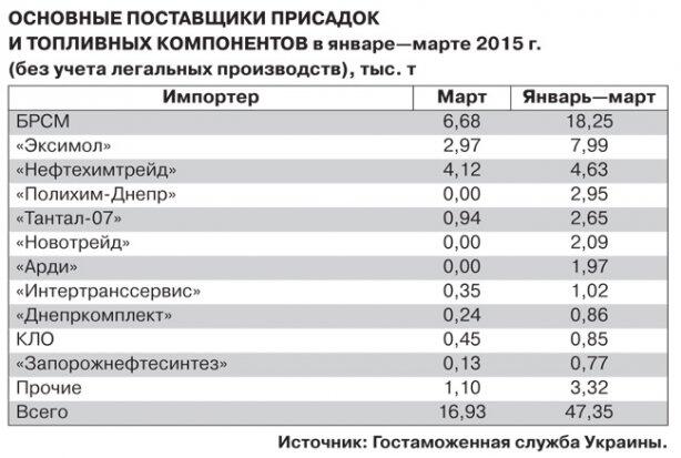 В самом импорте подобных товарных групп нет ничего противозаконного, но характерно, что их основные объемы приходятся на компании, которые не имеют своих перерабатывающих мощностей. В частности, крупнейшим поставщиком данной номенклатуры продукции остается компания "Укртрансойл-2009", входящая в группу БРСМ (18,25 тыс. т за первый квартал 2015 г.). Легендарным этот оператор стал благодаря уже тому, что использует огромные объемы компонентов и сырья для выпуска бензина под самым носом у всей фискальной рати — в Киевской области. По итогам первого квартала 2015 г., БРСМ привезла в Украину компонентов бензина больше, чем крупнейший легальный производитель страны — кременчугская "Укртатнафта" (около 14 тыс. т). 16 апреля структуры БРСМ выкупили 75% всего выставленного на торги деэтанпропанбутанизированного конденсата (ДЭПБК) — сырья для дальнейшей переработки, производимого на Шебелинском ГПЗ. Участники рынка говорят, что при смешивании с вышеупомянутым октаноповышающим и антидетонационным разнообразием ДЭПБК дает прекрасное горючее, отдаленно напоминающее бензин. По качеству, конечно, на любителя, но зато на несколько гривен на литре дешевле стандартизированного продукта.
