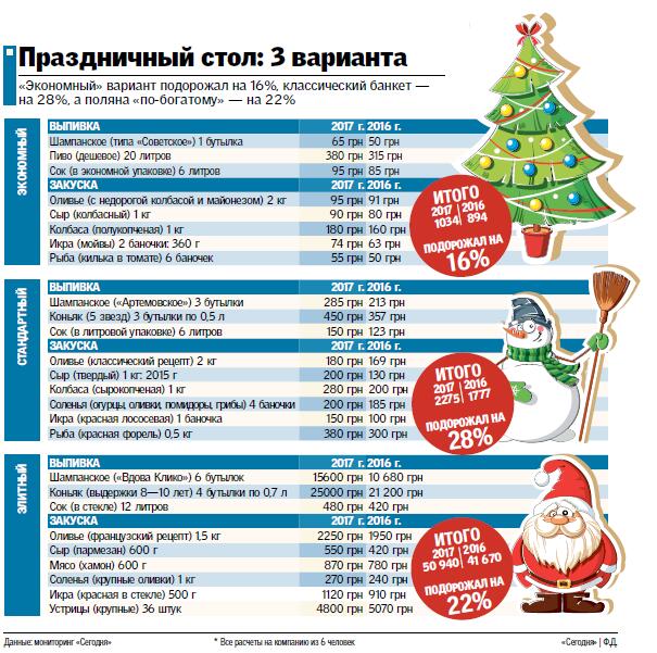 ЦЕНЫ. Как показал наш мониторинг, больше за год подорожал новогодний стол в среднем ценовом сегменте — на 28%. Но все равно это вдвое меньший рост, чем был год назад. Самый скромный набор блюд для новогоднего застолья стал дороже примерно на уровень прогнозируемой на конец года инфляции, или на 16% (было — на 66%). А вот на самое дорогое меню придется потратить на 22% больше, чем год назад (было — на 84%). Конечно, в деньгах "элитные" затраты увеличились больше всего — почти на 10 тыс. грн, что несоизмеримо с сотнями гривен для более скромного застолья. Но и у богатых есть свои радости — например, устрицы упали в цене. По словам директора Украинской ассоциации поставщиков торговых сетей Алексея Дорошенко, элитные товары в долларах даже подешевели, хотя в гривнях все равно подорожали на 10—12%. А вот украинские продукты и алкоголь выросли в цене более чем вполовину, прежде всего это твердые сыры и колбасы высшего сорта, коньяк, шампанское. Причина — повышение спроса из-за демократичных, по сравнению с импортными, цен и рост акцизов на спиртное.