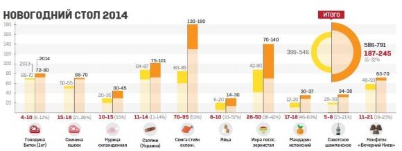 Отпраздновать новый 2015 год в Украине стало почти на треть дороже. Если раньше минимальный набор обошелся бы в 440–591 грн, то сейчас не меньше 640 грн. Виноват и курс валюты, и экономический кризис. Украинцы уже сейчас заранее закупают продукты и едут в села. Чтобы новогодний стол был полным — приходится экономить.