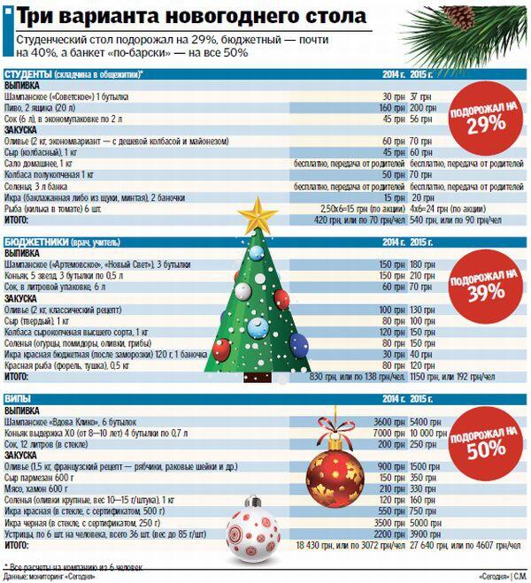 ЦЕНЫ . Застолье может быть любым: от скромного студенческого "за сотку с человека" до роскошного (см. инфографику). Но как показал наш мониторинг, за год деликатесы подорожали на 30—50%. По словам президента Украналитцентра Александра Охрименко, это случилось из-за инфляции (за 11 месяцев цены на продукты выросли в среднем на 19,7%) и девальвации гривни — год назад курс продажи наличного доллара был 8,3 грн, сейчас 16,4. "Цены могли бы вырасти больше, но их сдерживает покупательский спрос, поэтому продавцы вынуждены поступаться частью прибыли, — разъяснил Охрименко. — Например, оптовая цена банки маслин год назад была 1 доллар (8,3 грн), а продавали ее в рознице за 2 доллара (16 грн), имея навар до 100%. Сейчас она тоже стоит в опте 1 доллар (16 грн), но в рознице цена не 32 грн, а 22—24, то есть подорожание 38—50%, а не 100%, иначе товар окажется не по карману большинству.