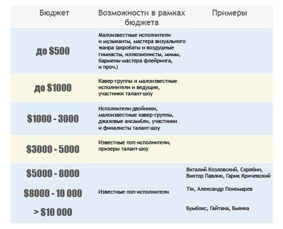 На сайте букингового агентства KievMusic приведены ориентировочные расценки на артистов. Точная стоимость выступления артиста на мероприятии зависит от места проведения коропратива (города) , характера мероприятия и даты его проведения.