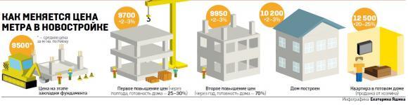 Одним из самых досадных моментов для покупателей недвижимости в рассрочку является то, что многие застройщики не фиксируют стоимость квартир на начальном уровне, а цена метра может (в смысле обязательно будет) меняться. Такой пункт есть в договоре, но для будущего хозяина квартиры может оставаться сюрпризом, насколько конкретно и когда вырастет стоимость квадратного метра в следующий раз. Цена может повышаться постепенно (в среднем 2–3 раза за весь период выплат), а может за несколько месяцев до завершения строительства подскочить на 10–15%. «Мы не скрываем, что по мере продвижения строительства объекта будет расти стоимость квадратного метра, — рассказали в отделе продаж одного из ЖК столицы. — Из расчета, что дом строится в среднем 1,5 года, повышение происходит один раз в три-пять месяцев на 2–3%. Об этом мы предупреждаем покупателей за две недели. Повышение цен обычно обусловлено подорожанием стройматериалов и степенью готовности объекта». Специалисты подчеркнули, что застройщики, которые не меняют стоимости метра, скорее всего, сразу закладывают высокую цену метра.