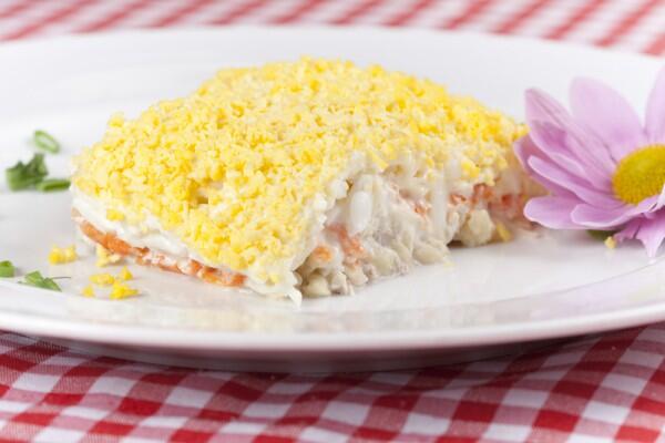 Этот салат хорош тем, что существует огромное количество вариантов раскладки продуктов. Кроме того, можно экспериментировать с ингредиентами: использовать для салата свежие овощи и заменить рыбу на отварное мясо.