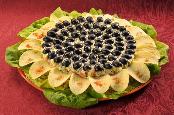 Украсить салат половинками маслин. По кругу воткнуть чипсы.