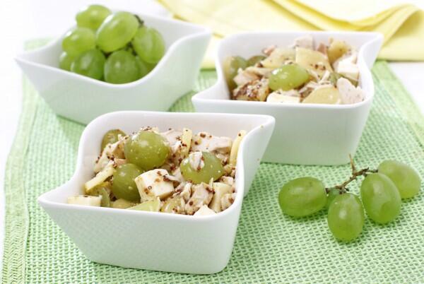 Каждый слой смазать майонезом (можно посыпать небольшим количеством измельченных миндальных орехов). Последний слой - это нарезанные пополам красивые большие зеленые виноградины. Они укладываются срезом вниз.