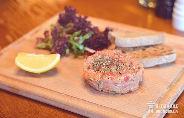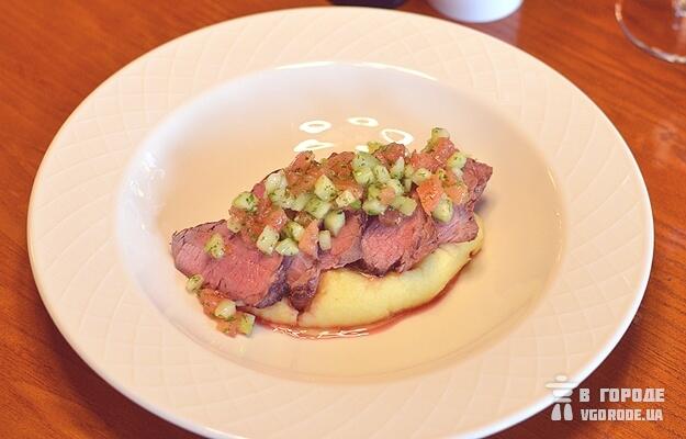 Тальята с картофельным копченым пюре и свежим овощным тартаром 270г/137 грн.