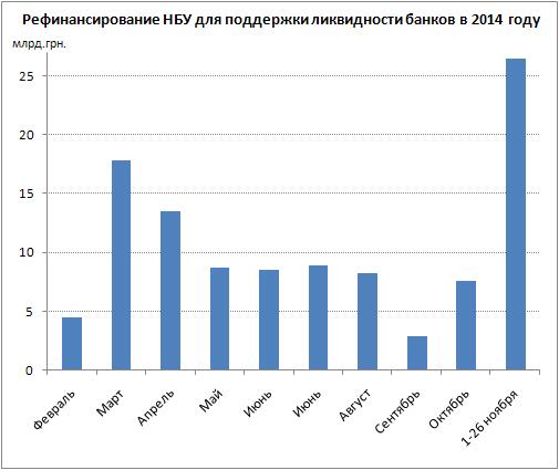За 26 дней ноября Национальный банк выделил банкам на поддержку ликвидности 26,5 млрд. гривен рефинансирования. Это самый большой объем по итогам месяца за весь 2014 год. За всю историю независимости больше НБУ выделял банкам лишь во время начала первой волны кризиса – в ноябре 2008 года (44 млрд. грн.) и в декабре 2008 года (44 млрд. грн.).