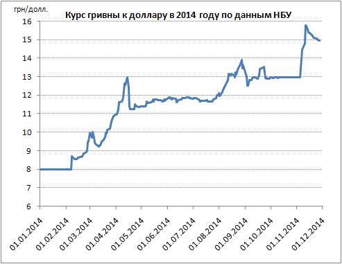 В начале ноября регулятор перешел от фиксированного курса к гибкому – в результате, доллар взлетел, показав пик 11 ноября – когда за одну единицу инвалюты давали 15,77 гривен. В конце месяца курс гривны немного отыграл свои позиции, и по состоянию на 27.11.2014 г. составил 14,97 гривен за доллар. Тем не менее, с начала года национальная валюта упала по отношению к доллару почти в два раза.