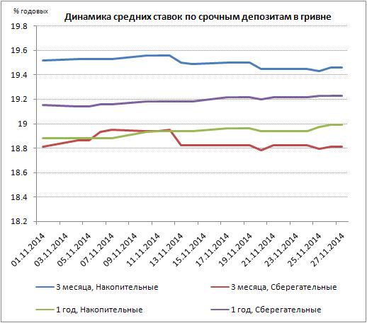 Средние ставки по депозитам в гривне, наконец, стабилизировались – впервые за 2014 год. Помимо этого, в конце ноября доходность по ставкам по срочным вкладам на год и на три месяца как никогда приближена. По данным компании «Простобанк Консалтинг» на 27.11.2014 г. средняя ставка по вкладам сроком на три месяца без права пополнения, но с правом частичного снятия (сберегательным депозитам) от банков из числа 50-ти крупнейших по размерам активов составила 19,5% годовых. Средняя ставка по вкладам на тот же срок с правом пополнения и без права частичного снятия (накопительным депозитам) – составила 18,8% годовых. Средняя доходность по депозитам сроком на год составила соответственно 19 и 19,33% годовых.