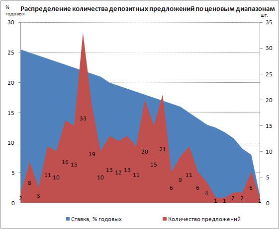 Максимальную на рынке ставку по срочному депозиту в 25,5% годовых предлагают всего два банка из топ-50, а 25% годовых – можно получить уже в восьми банках (по данным компании «Простобанк Консалтинг» на 27.11.2014 г.). Наиболее часто на рынке встречается доходность в 22% годовых (33 предложения), и 21,5% годовых (19 предложений). Следующая по частоте предложений ставка по вкладу – 18% годовых (20 предложений), 17,5% годовых (15 предложений) и 17% годовых (21 предложение).