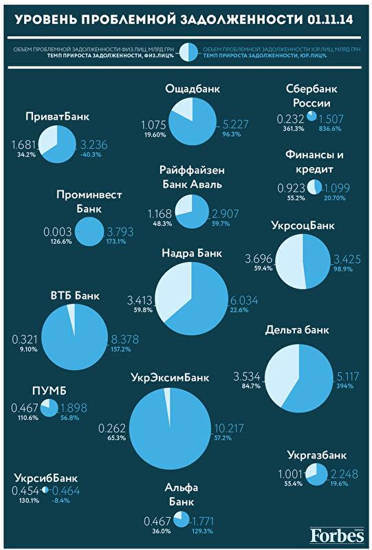 Так, по состоянию на 1 ноября 2014 года только у крупнейших банков Украины в портфелях находилось более 57 млрд гривен проблемной задолженности юрлиц и почти 19 млрд гривен – физлиц.
