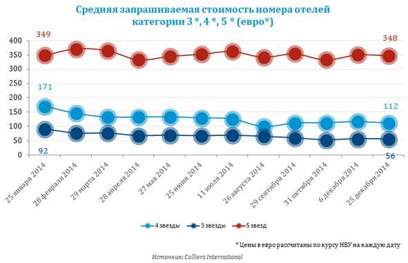 По данным Colliers, наиболее финансово устойчивыми оказались 5- и 4-звездочные гостиницы (стоимость номеров в евро). В среднем стоимость номера в евро, по состоянию на конец 2014 года, по сравнению с началом года в отелях категории 5* практически не изменилась, а в отелях категории 4* и 3* понизилась на 35 и 39% соответственно. Несмотря на различия в ценовой политике, доходы отелей различного класса снизились в среднем на 40% в евро. ![]()