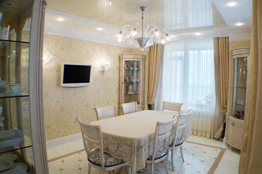 Главное, чтобы столовая не напоминала больницу – скучные и голые стены. Глазам сидящего должно быть комфортно – картины на стенах, узоры на обоях, элементы декора или пейзаж за окном не должны напрягать. Избегать следует лишь установки телевизора, не способствующего умиротворенному поглощению пищи и беседе за столом.
