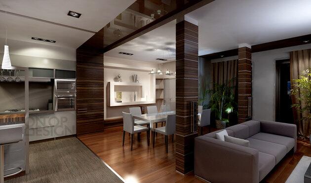 Обустройство обуденной зоны в гостиной или в варианте open space предусматривает зонирование, то есть разделение пространства на функциональные зоны. Оно, скорее всего, будет мягкое, почти незаметное, особенно если обеденная зона объединяется с местом для отдыха.