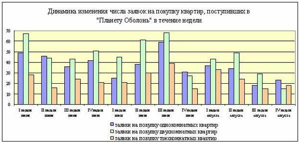 Динамика изменения числа заявок на покупку одно-, двух- и трехкомнатных квартир показана на диаграмме (учтены лишь полные недели того или иного месяца).