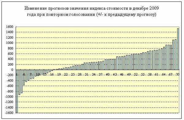 Положительные значения на диаграмме означают, что при повторном голосовании респонденты выбрали более высокие значения декабрьского индекса стоимости; отрицательные - что выбрали более низкое. Первых оказалось заметно больше. Но были и те, кто резко снизил первоначальную оценку. В частности, при первом голосовании указал рост, а при повторном - заметное снижение.