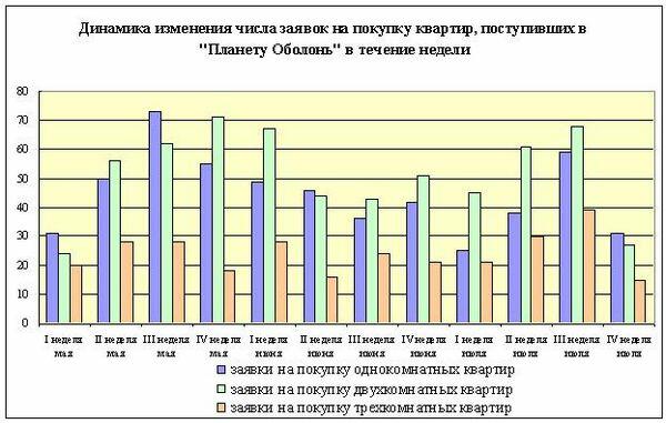 Говоря о снижении деловой активности, необходимо отметить, что количество заявок на покупку квартир осталось почти на том же уровне (в июне в «Планету Оболонь» поступило 510 заявок, в июле 501 заявка). Динамика изменения числа заявок на покупку одно-, двух- и трехкомнатных квартир показана на диаграмме (учтены лишь полные недели того или иного месяца).