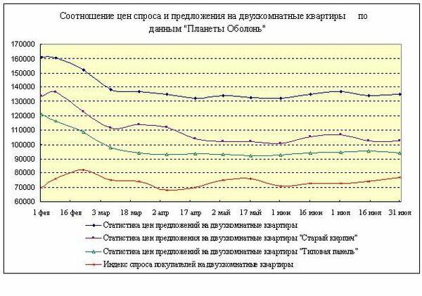 Количество предложений увеличилось на 7% (01.07.09 в актуальной базе «Планеты Оболонь» было 3707 объектов на продажу, а 01.08.09 - 3985 объектов). Просмотров было достаточно много; но нередко они напоминали экскурсии: люди ходили на просмотры не с целью приобрести квартиру, а чтобы понять процессы, происходящие на рынке недвижимости.