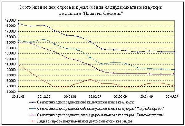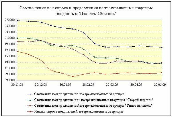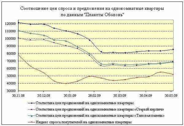 Количество предложений оставалось на стабильно низком уровне (01.05.09 в актуальной базе «Планеты Оболонь» было 3608 объектов на продажу, а 01.06.09 - 3584 объектов). Для Киева это очень мало. Подобрать квартиру с необходимыми параметрами в нужном районе бывает очень непросто. И это одна из основных причин того, почему, не смотря на огромное количество публикаций о грядущем падении цен, продавцы уступают очень неохотно.