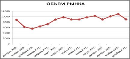 Объем предложения на рынке недвижимости Крыма в течение 2011 г. возрос с 6463 до 9053 пунктов. Наиболее высокий показатель был отмечен в ноябре (10993 пункта).