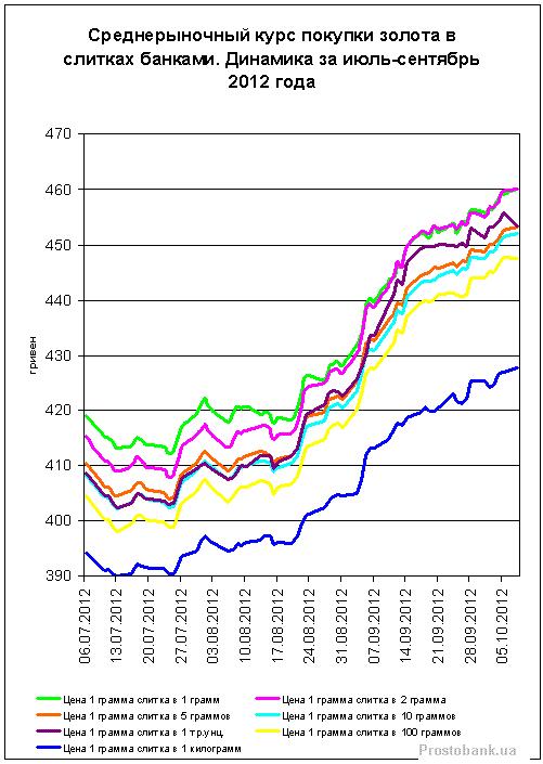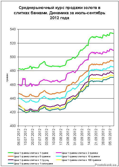 Средняя стоимость покупки золотых слитков также выросла – для масс до 100 граммов включительно на 10% (с 410-420 до 450-460 гривен/грамм), для более крупных масс – на 6%-8%, например, для слитков в 1 килограмм с 400 до 425 гривен/грамм. Но повышение закупочных цен в начале сентября 2012 года шло медленнее, чем увеличение отпускной стоимости, а потому в конце сентября первое продолжило двигаться вверх, тогда как второе уже вышло на горизонталь.