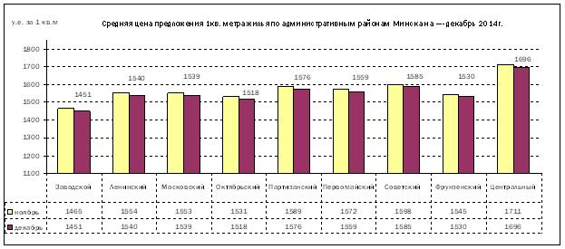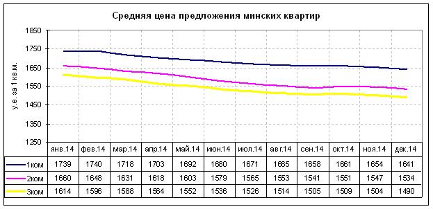 За 2014 год цены на квартиры в Минске подешевели на 7,5%. В январе 2014 года средняя цена предложения составляла 1 671 долл за квадратный метр, в декабре – 1 555. Такая цена «квадрата» в 1 550 долл наблюдалась в июне 2013 года.