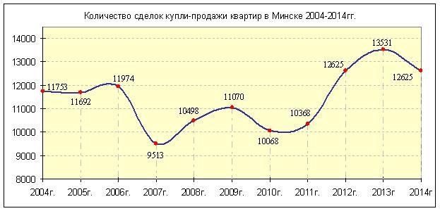 В 2014 году рынок жилья показывал высокую активность. За год в Минске зарегистрировано 12 625 договоров. Это на 6% меньше, чем годом ранее, когда наблюдалась самая высокая активность последних 10 лет. По активности 2014 год оказался на 2-м месте после 2013-го. Наименьшее количество сделок было в 2007 году – 9 505. В декабре в Минске продано 1 179 квартир, что на 17% больше, чем в ноябре. Наибольшее число сделок купли-продажи квартир было зарегистрировано в октябре – 1 371.
