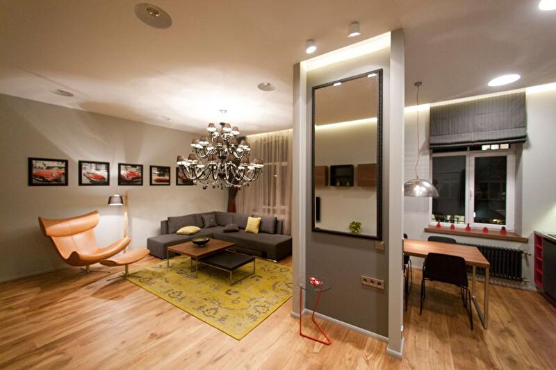 Дизайн выполнен в сочетании минимализма и функциональности, в приятной, мягкой цветовой гамме. Дизайнеры применили принцип зонирования, благодаря чему однокомнатная квартира не кажется слишком маленькой, а наоборот, очень уютной.