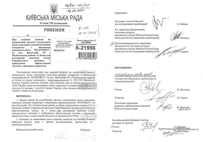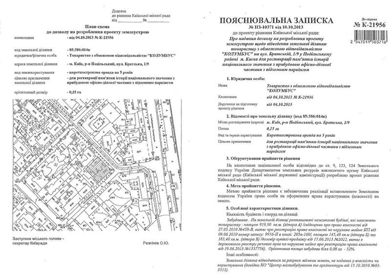 Початково проект рішення містив інше формулювання: реставрація існуючої будівлі пам’ятки – плюс прибудова офісу з підземним паркінгом. Однак питання було розглянуте Комісією з питань культури та туризму. Оскільки ділянка розташована в Центральному історичному ареалі, в межах Державного історика-культурного заповідника «Стародавній Київ» та в межах території пам’ятки археології «Культурний шар Подолу», то це земля історико-культурного призначення. Відтак «прибудову» з проекту рекомендували прибрати. Земельна комісія погодила проект за умови, що існуючу пам’ятку архітектури реставрують, а під офіс реконструюють інші споруди, підземний паркінг в проекті лишився.