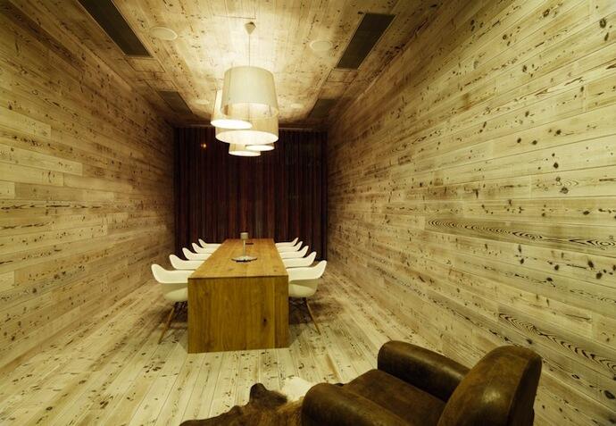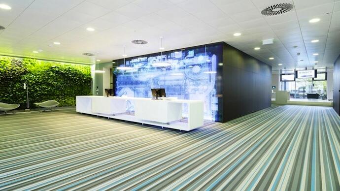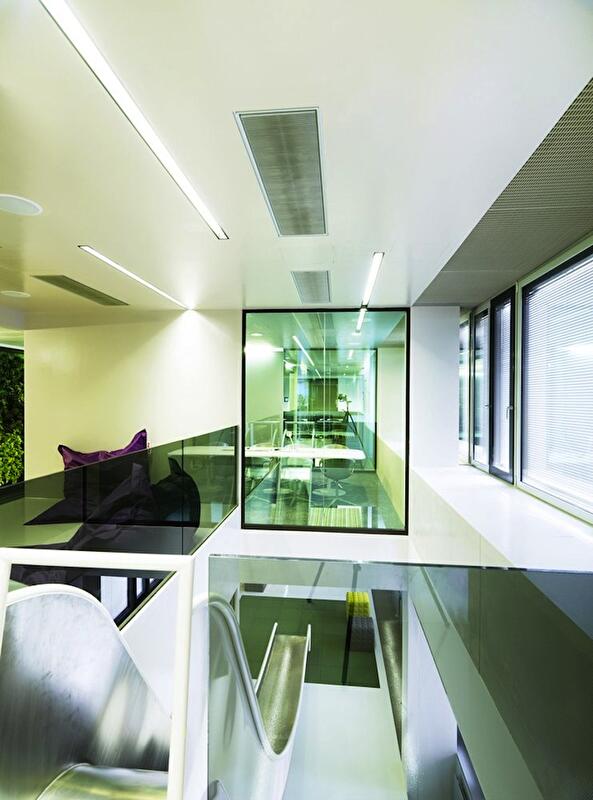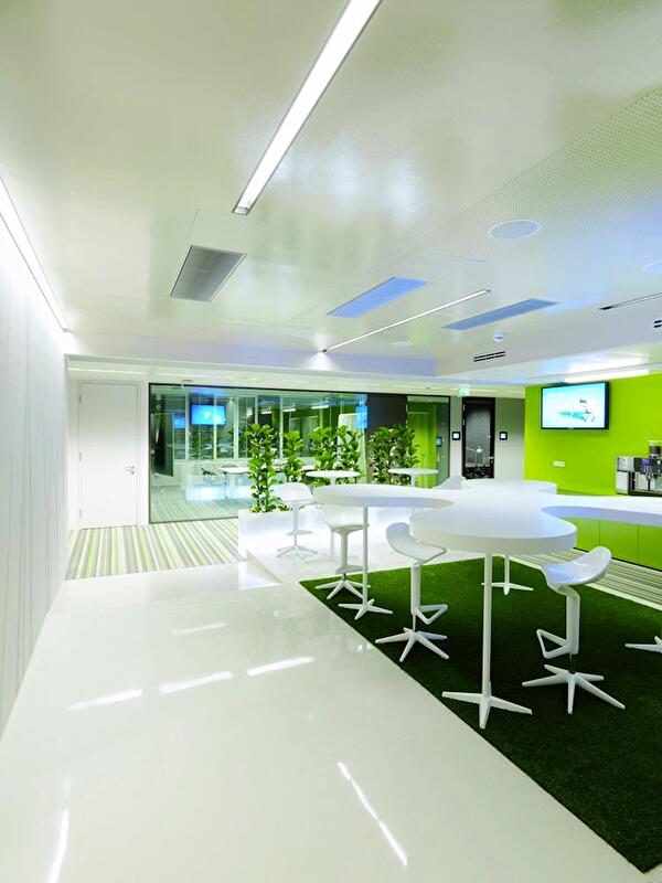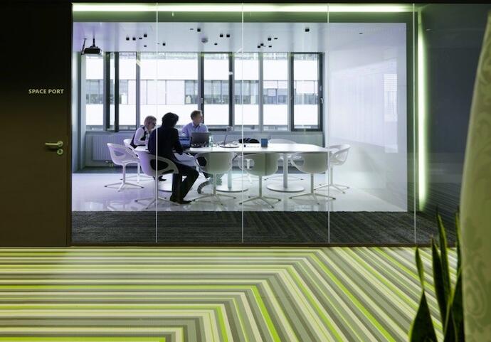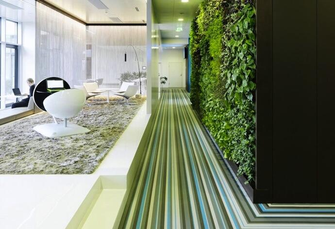 Основной целью дизайнеров было создать помещение, оформление которого располагало бы к продуктивной работе и при этом благоприятно действовало на эмоционально-психологическое состояние сотрудников. В результате получился яркий, непринужденный офис с разноцветными стенами, украшенными природными принтами, зелеными полами, имитирующими травяное покрытие, и большим количеством легкого стекла, использованного вместо стен, — чтобы расширить пространство и отказаться от четко выраженных границ.