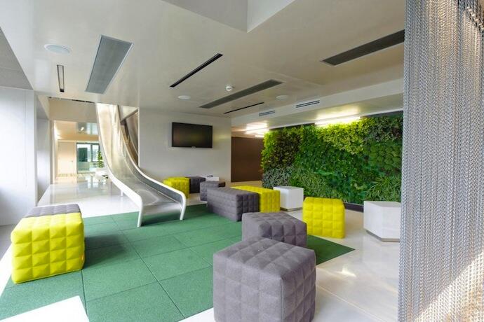 Особое внимание было уделено зоне отдыха, в которой в хаотичном порядке разбросаны мягкие мини-диваны и пуфики, а попасть в нее можно, скатившись вниз со второго этажа на самой настоящей горке! Легкие и невесомые конструкции, светлые акценты в интерьере, а также полная непохожесть на классичекое деловое помещение делают новую штаб-квартиру Microsoft настоящим офисом мечты.