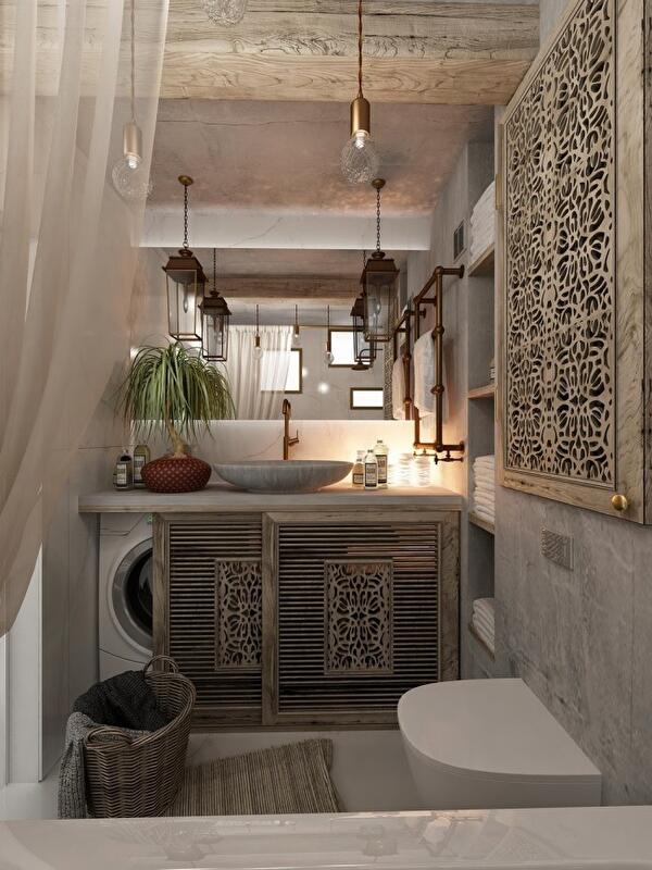 Санузел квартиры, оформленной в духе Востока, не может быть безликим и неинтересным. Он всегда напоминает что-то среднее между уютным будуаром и роскошной спа-зоной. Аксессуары, смесители, сантехнику для такой ванной нужно подбирать с особой аккуратностью и тщательностью. Также стоит внимательно отнестись к выбору стиральной машины: остановитесь на изящной, стильной, лаконичной модели, чтобы не нарушить изысканную атмосферу интерьера.