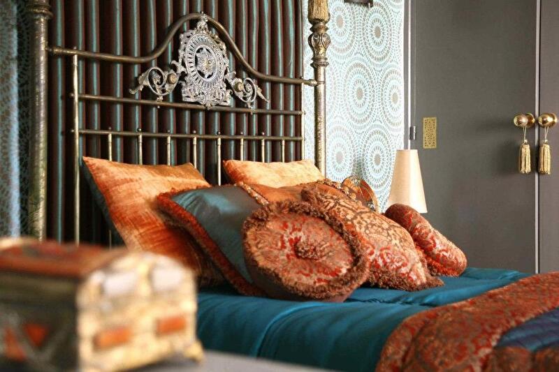 Восточный стиль привлекает оригинальными приемами оформления пространства. Как насчет резного изголовья кровати, низких столиков с подушками на полу, обустроенной кальянной или специальной зоны для чаепитий?
