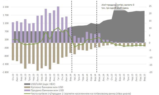 Основной целью валютных ограничений было "сбить" панический спрос на валюту со стороны населения и остановить неконтролируемое обесценивание гривни. Если с августа 2013 года население активно покупало валюту, то после введения лимита в 15000 гривен, ситуация на короткое время стабилизировалась. Впоследствии, осенью 2014-го, когда Украина рассчитывалась по своим внешним обязательствам ($641), а Нафтогаз активно закупал валюту (совокупно почти $2), спрос на иностранную валюту вновь повысился. НБУ отреагировал "закруткой гаек", уменьшив лимит на покупку иностранной валюты для населения до 3000 гривен в эквиваленте. Но, поскольку большого объема спроса в этом сегменте на официальном рынке уже не было, это не смогло удержать гривну от падения. Резкий спад объема торгов, при этом, может сигнализировать, что население просто перевело валютные операции на "черный рынок", а ограничения вылились в снижение прозрачности и контролируемости.