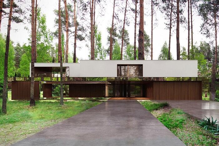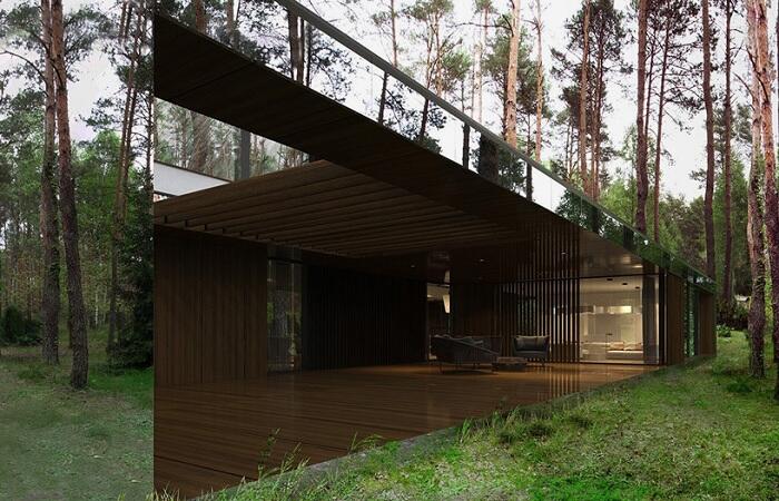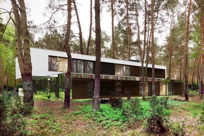 Дом в лесу, построенный архитектором Marcin Tomaszewski. В остальном планировка жилища вполне соответствует загородному дому. Основной вход, гараж и крытая терраса находятся с обратной стороны здания.
