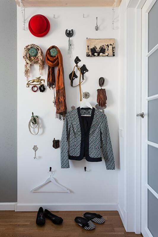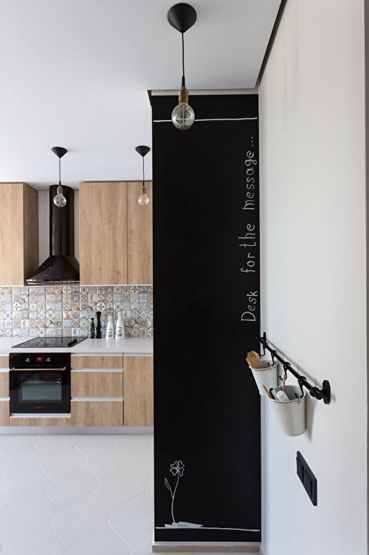 Личные черты интерьеру придают такие запоминающиеся детали, как декоративная стена в спальне с крючками и вешалками для одежды и аксессуаров, а также меловая доска, при помощи которой можно передавать сообщения друг другу или просто оставить смайлик, чтобы поделиться настроением.
