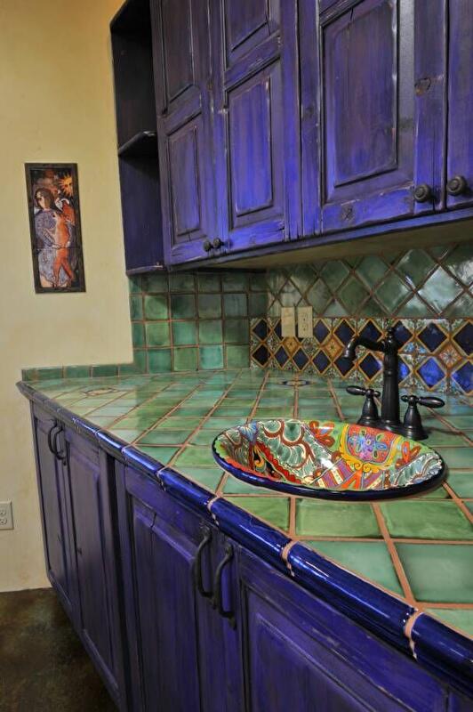Если интерьер кухни оформлен в жизнерадостных тонах или, напротив, требует цветового акцента, обратите внимание на цветные раковины. Это может быть яркое цельное покрытие, мозаика или расписной узор.